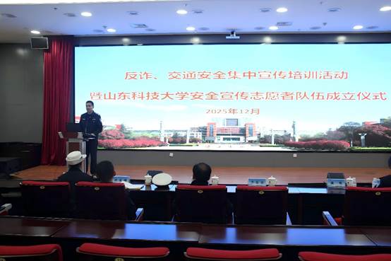 为全面提升大学生的安全防范意识与自我保护能力,构建平安和谐的校园环境,12月24日,安全管理处党支部以党建共建为纽带,联合青岛市公安局黄岛分局辛安派出所、交管大队等单位,在求新讲堂隆重举办反诈、交通安全集中宣传培训活动暨学生安全宣传志愿者队伍成立仪式。此次活动是支部践行“五度共建创心安”党建合作协议的具体实践,通过组织联动、资源共享,推动校园安全宣传工作走深走实。